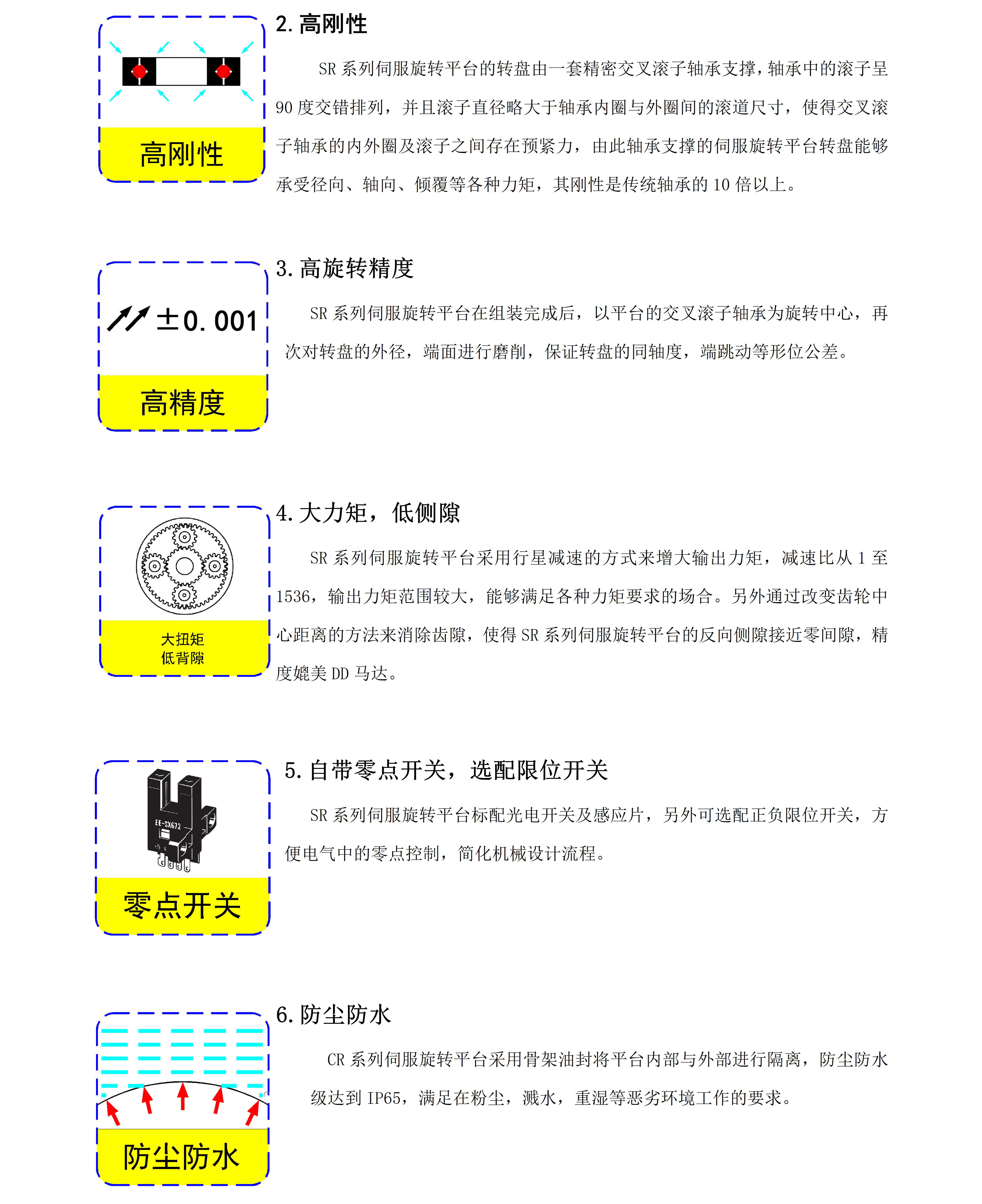 公司所生产的伺服旋转工作台的输出旋转法兰均采用交叉滚子轴承支撑,交叉滚子轴承中的滚子呈交错90度的排列,并且轴承在出厂前通过过盈配合的方式增加预紧力矩,公司由此轴承支撑的伺服旋转平台具有承受径向、轴向、倾覆力矩等各种载荷的特性,与传统圆锥滚子组合轴承相比,其刚度提高10-20倍。